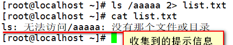 [root@localhost ~]# ls /aaaaaaaaa 2> list.txt