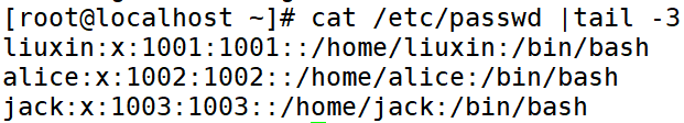 [root@localhost ~]# cat /etc/passwd | tail -3