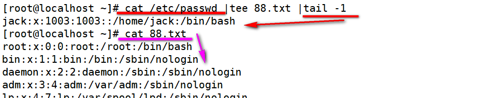 [root@localhost ~]# cat /etc/passwd |tee 88.txt | tail -1