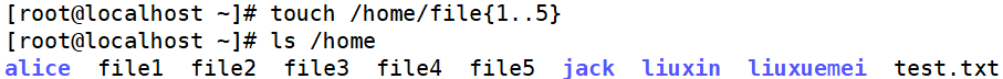 [root@localhost ~]# touch /home/file{1..5}