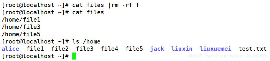 [root@localhost ~]# cat files |xargs rm -rv f