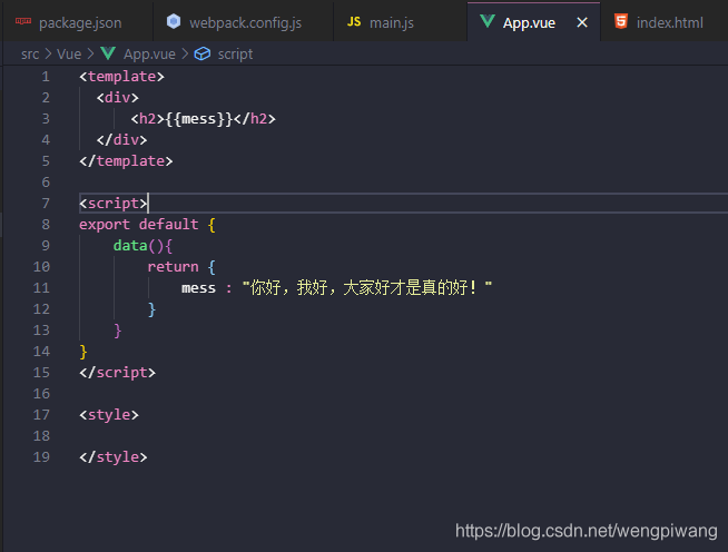 这就是在Vue组件中编写的mess用h2标签显示的数据