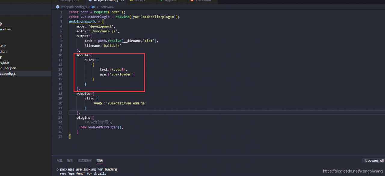 在Webpack中配置Vue扩展包,在webpack.config.js中编写: