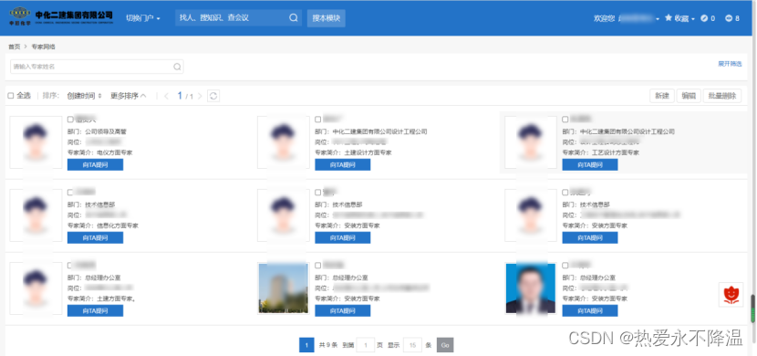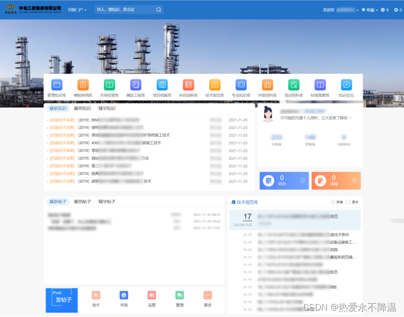 - 知识仓库:根据业务类型形成了模板样例库、精品工程库、科技创新库等10 大知识库,各知识库归属对应组织架构,分别梳理完成知识库分类;明确了阅读、上传、编辑、下载权限,知识属性及文档审批流程,保障知识资产安全可控。截至目前各部门上传总计超10000份知识文档。