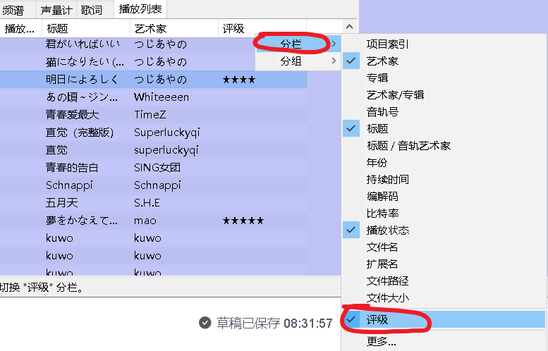 最后,右键播放列表的顶栏——分栏——评级,就可以显示曲目的好听指数了。