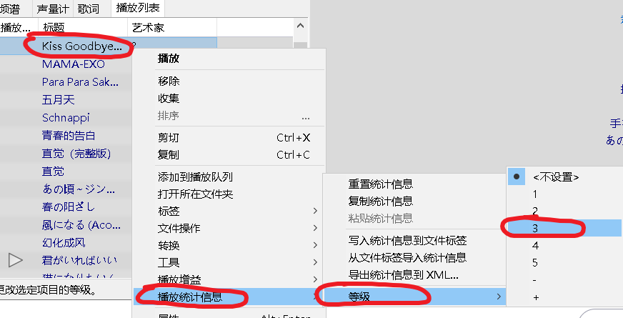 具体操作:右键歌曲——播放统计信息——等级——选择一个级别