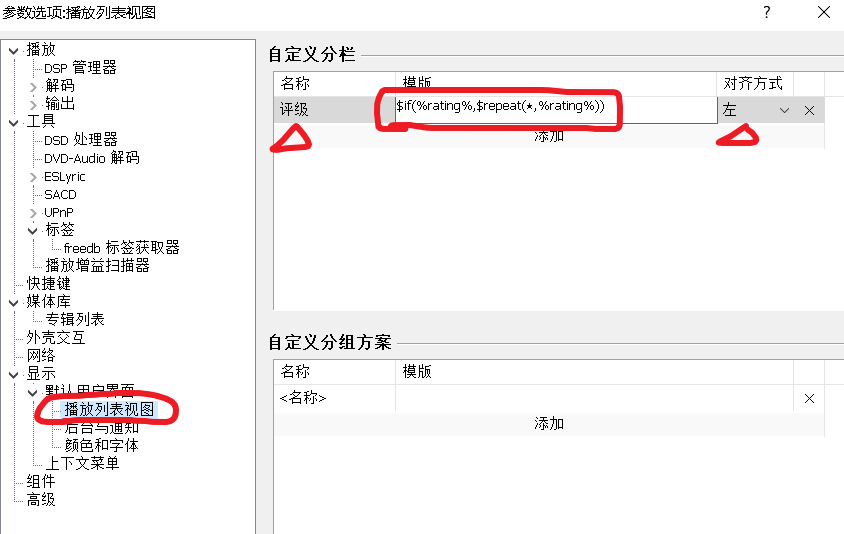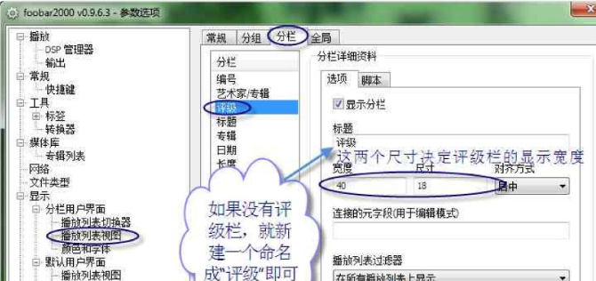 在Foobar非常早期的版本中,不是填入模板,而是脚本中;如下图的分栏详细资料窗口,选项旁边有一个脚本。