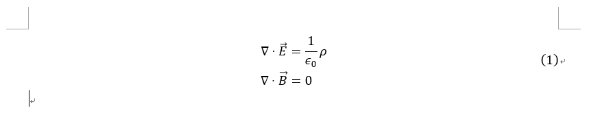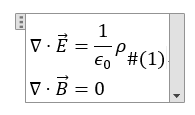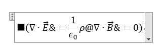 \eqarray(\nabla \cdot E \vec &=1/\epsilon_0 \rho@\nabla \cdot B \vec &=0)