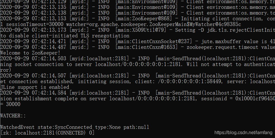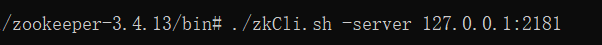 接下来启动客户端。输入命令 ./zkCli.sh -server 127.0.0.1:2181 (-server参数就代表我们要连接哪个zookeeper服务端)