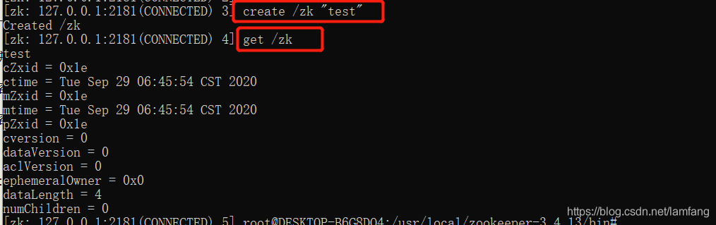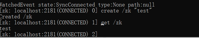 同样输入create /zk "test" 和get /zk测试一下