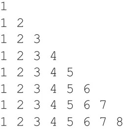 清单3 首先初始化max变量为8,之后通过变量x从1到max+1执行循环。内层循环有一个值为从1到x+1的循环变量y,并打印y的值。它的输出如下所示: