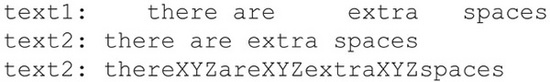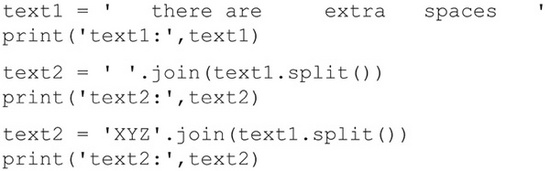 split()函数将一个文本字符串"分割"为一系列的单词,同时去掉多余的空格。接下来join()函数使用一个空格作为分隔符将字符串text1中的单词连接在一起。上述代码的最后部分使用字符串XYZ替换空格作为分隔符,执行相同的连接操作。上述代码的输出如下: