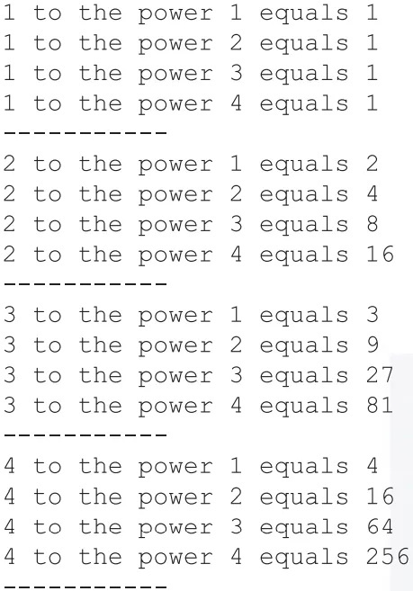 代码的第二部分通过一个for循环调用pwr()函数从1到maxCount+1的值。它的输出如下所示:
