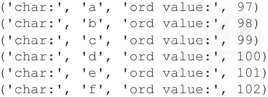 清单8 的代码简单直接地通过一个for循环遍历字符串text并打印它的每个字符以及字符的ord值(ASCII 码)。清单8 的输出如下所示: