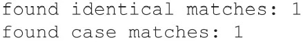 清单4 通过split()函数对字符串x中的每个单词与单词abc进行比较。如果单词精确匹配,就将identical变量加1 ;否则就尝试不区分大小写进行比较,若匹配就将casematch变量加1。
