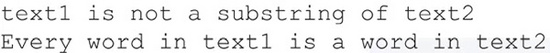 清单7 的后半部分通过一个循环遍历字符串text1中的每个单词,并判断其是否出现在text2中。如果发现有匹配失败的情况,就设置变量subStr为False,并通过break语句跳出循环,提前终止for循环的执行。最后根据变量subStr的值打印对应的信息。清单7 的输出如下所示: