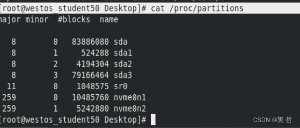 [root@westos_student50 Desktop]# cat /proc/partitions 查看系统识别设备