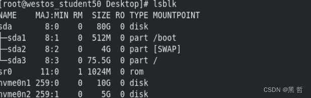 [root@westos_student50 Desktop]# lsblk 查看设备正在被谁使用