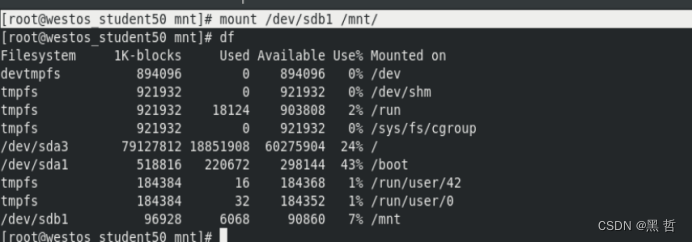 [root@westos_student50 mnt]# mount /dev/sdb1 /mnt/ 把/dev/sdb1挂载到/mnt
