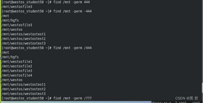[root@westos_student50 ~]# find /mnt -perm 444 查找权限是444的