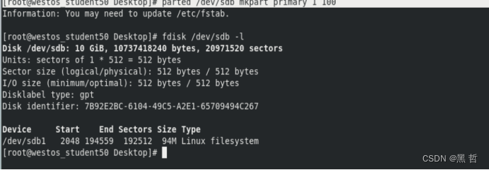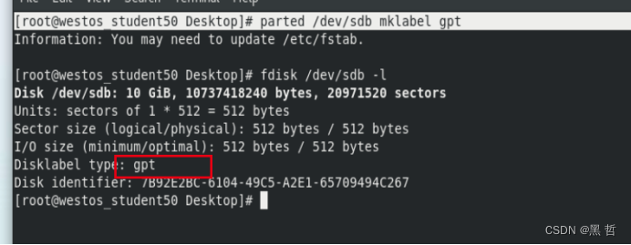 [root@westos_student50 Desktop]# parted /dev/sdb mklabel gpt 设定gpt分区