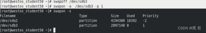 [root@westos_student50 ~]# swapon -a /dev/sdb3 -p 1 修改权限为1