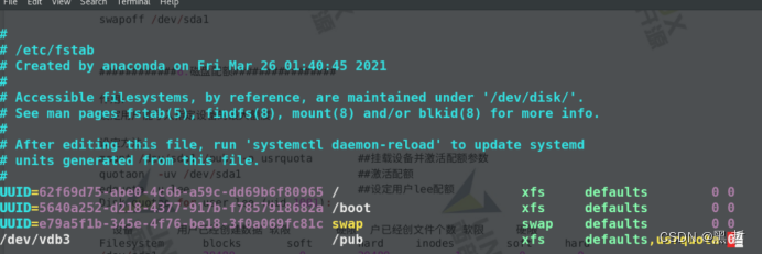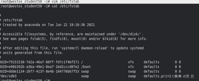[root@westos_student50 ~]# vim /etc/fstab 永久修改