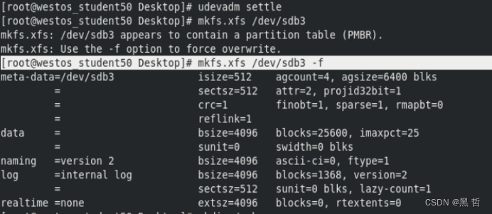 [root@westos_student50 Desktop]# mkfs.xfs /dev/sdb3 -f 强制格式化