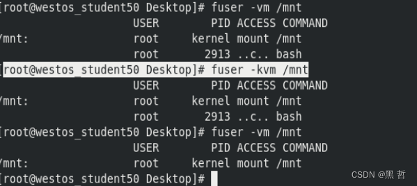 [root@westos_student50 Desktop]# fuser -vm /mnt 查看正在允许的设备