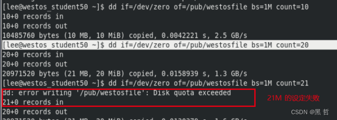 [lee@westos_student50 ~]$ dd if=/dev/zero of=/pub/westosfile bs=1M count=21设定磁盘配额为21M(设定失败)