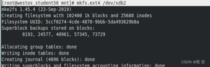 [root@westos_student50 mnt]# mkfs.ext4 /dev/sdb2 ext4格式化