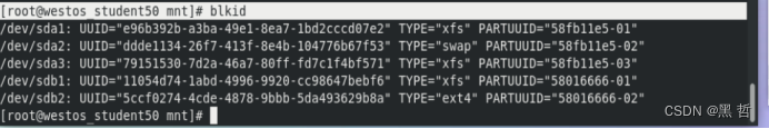 [root@westos_student50 mnt]# blkid 查看硬盘id