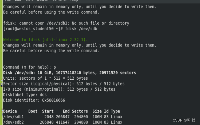 [root@westos_student50 ~]# fdisk /dev/sdb