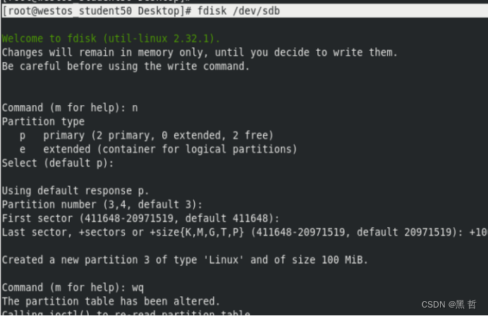 [root@westos_student50 Desktop]# fdisk /dev/sdb 建立sdb3分区