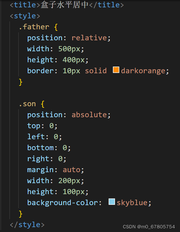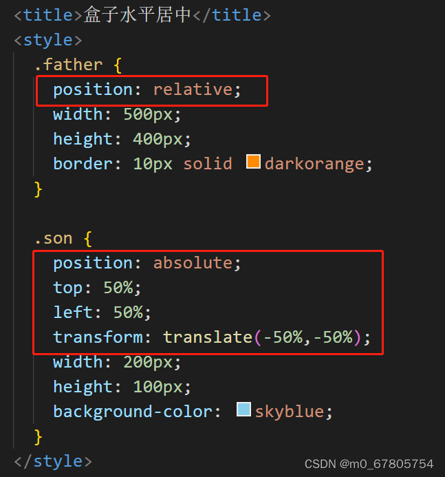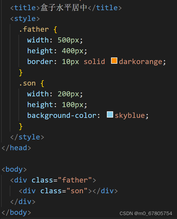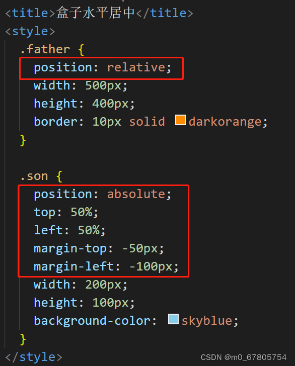 5、子盒子设置margin-left:-100px,让盒子向上行走自身宽度的一半,实现子盒子水平居中.