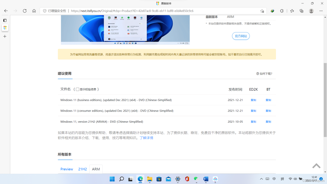 打开Next Itellyou网站,没注册的注册一个账号,然后点击“Windows 11”(或Windows 10),下滑到如图所示的位置,复制“Windows 11/10, version 21H2 (ARM64) - DVD (Chinese-Simplifed)”后面的ED2K下面的“复制”,然后打开迅雷