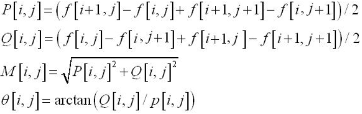 其中f为图像灰度值,P代表X方向梯度幅值,Q代表Y方向 梯度幅值,M是该点幅值,Θ是梯度方向,也就是角度。