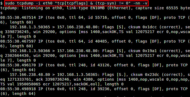 - # tcpdump -r <interface> "tcp[tcpflags] & (tcp-syn|tcp-ack) != 0"