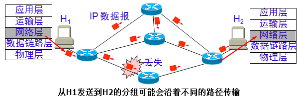 - 网络节点每一个节点提供独立的路由选择,无法保证数据报按顺序到达目的节点,也无法保证数据报中途不丢失.