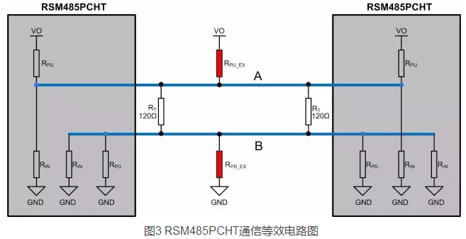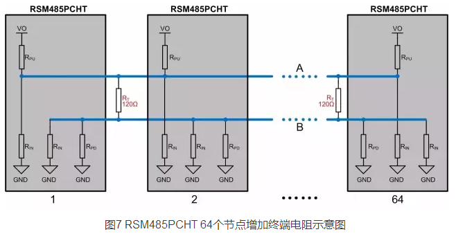 以RSM485PCHT为例说明增加上下拉电阻的情况,如图6所示,总线A或B的共模负载为: