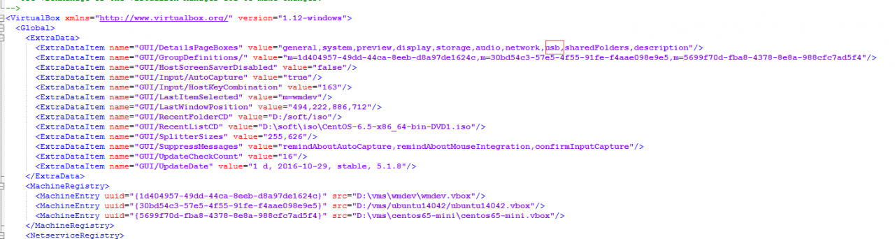 打开VirtualBox.xml文件,把下面红圈中的usb去掉,然后再重启虚拟机就正常了