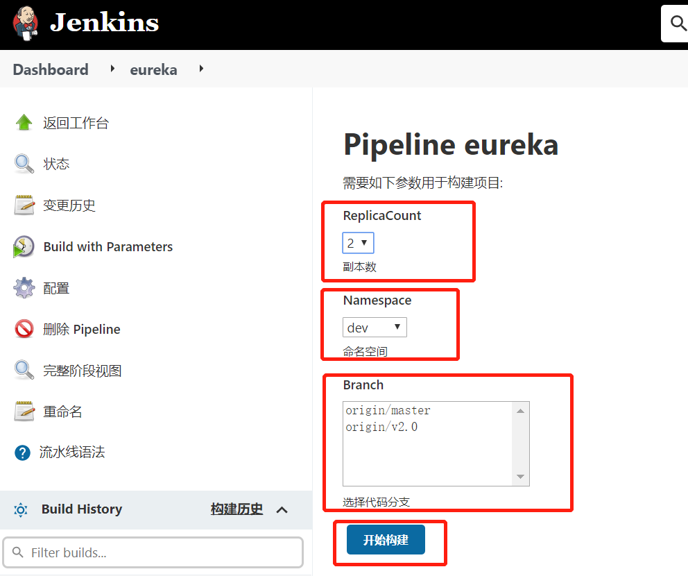 构建项目:可以选择启动的副本数、项目代码分支、k8s命名空间(dev、test、prod:代表开发、测试、生产环境)