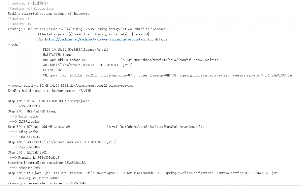 | 123456789101112131415161718192021222324252627282930313233343536373839404142434445464748495051525354555657585960616263646566676869707172737475767778798081828384858687888990919293949596979899100101102103104105106107108109110111112113114115116117118119 | def registry = "10.48.14.50:8888"``def project = "dev"``def app_name = "eureka-service"``def jar_path = "build/libs"``def jar_name = "${app_name}-0.0.1-SNAPSHOT.jar"``def jar_port = "8761"``def image_name = "${registry}/${project}/${app_name}:${BUILD_NUMBER}"``def git_address = "http://10.48.14.100:30080/001/xiangmu.git"``// 认证``def secret_name = "registrypullauth"``def docker_registry_auth = "b07ed5ba-e191-4688-9ed2-623f4753781c"``def git_auth = "a5ec87ae-87a1-418e-aa49-53c4aedcd261"``def k8s_auth = "3cd3f414-a0e2-4bc0-8808-78c64e6ad7d2"``def JAVA_OPTS = "-Xms128m -Xmx256m -Dfile.encoding=UTF8 -Duser.timezone=GMT+08 -Dspring.profiles.active=test" pipeline {``agent {``kubernetes {``label "jenkins-slave"``yaml ""``"``kind: Pod``metadata:``name: jenkins-slave``spec:``containers:``- name: jnlp``image: "${registry}/library/jenkins-slave-jdk:latest"``imagePullPolicy: Always``env: - name: TZ``value: Asia/Shanghai``volumeMounts:``- name: docker-cmd``mountPath: /usr/bin/docker``- name: docker-sock``mountPath: /``var``/run/docker.sock``- name: gradle-cache``mountPath: /root/.gradle``volumes:``- name: docker-cmd``hostPath:``path: /usr/bin/docker``- name: docker-sock``hostPath:``path: /``var``/run/docker.sock``- name: gradle-cache``hostPath: path: /tmp/gradle``""``"``}``}``parameters {``choice (choices: [``'1'``, '2'``, '3'``, '5'``, '7'``], description: '副本数'``, name: 'ReplicaCount'``)``choice (choices: [``'dev'``,``'test'``,``'prod'``,``'default'``], description: '命名空间'``, name: 'Namespace'``)``}``stages {``stage(``'拉取代码'``){``steps {``checkout([$``class``: 'GitSCM'``, branches: [[name: "${params.Branch}"``]], doGenerateSubmoduleConfigurations: false``, extensions: [], submoduleCfg: [], userRemoteConfigs: [[credentialsId: "${git_auth}"``, url: "${git_address}"``]]``])``}``} stage(``'代码编译'``){``steps {``sh ""``"``java -version``pwd``cd ${app_name}``pwd``gradle -v``gradle clean build -x test``""``" }``} stage(``'构建镜像'``){``steps {``withCredentials([usernamePassword(credentialsId: "${docker_registry_auth}"``, passwordVariable: 'password'``, usernameVariable: 'username'``)]) {``sh ""``"``echo '``FROM ${registry}/library/java:11``MAINTAINER liang``RUN apk add -U tzdata && \``ln -sf /usr/share/zoneinfo/Asia/Shanghai /etc/localtime``ADD ${jar_path}/${jar_name} /``EXPOSE ${jar_port}``CMD java -jar $JAVA_OPTS /${jar_name}``'> ${app_name}/Dockerfile``docker build -t ${image_name} ${app_name}``docker login -u ${username} -p ${password} ${registry}``docker push ${image_name}``""``"``}``} } stage(``'部署到K8S平台'``){``steps {``configFileProvider([configFile(fileId: "${k8s_auth}"``, targetLocation: 'admin.kubeconfig'``)]) {``sh ""``"``pwd``sed -i 's#IMAGE_NAME#${image_name}#' ${app_name}/deploy.yaml``sed -i 's#SECRET_NAME#${secret_name}#' ${app_name}/deploy.yaml``sed -i 's#RSCOUNT#${ReplicaCount}#' ${app_name}/deploy.yaml``sed -i 's#NS#${Namespace}#' ${app_name}/deploy.yaml``kubectl apply -f ${app_name}/deploy.yaml -n ${Namespace} --kubeconfig=admin.kubeconfig``sleep 10``kubectl get pod -n ${Namespace} --kubeconfig=admin.kubeconfig``""``"``}``}``}``}``} |