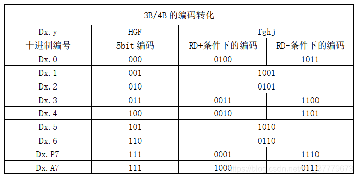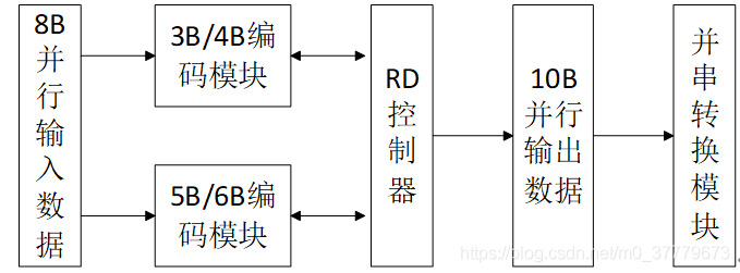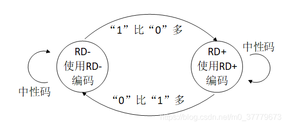 当目前已编码序列整体为RD=-1时,表示之前传输的数据中"0"的个数多于"1"的个数,若下一个要选取的6B或4B编码的不一致性(Disparity)为0,则编码后序列整体的运行不一致性依然为RD=-1;若下一个要选取的6B或4B编码的为Disparity=+2,则编码后序列整体的运行不一致性就变为RD=+1。反之亦然,当目前已编码序列整体的RD为RD+时,下一位就选择RD-的编码,序列整体的RD就变为RD+,以此来平衡整个序列的运行不一致性(即0、1的平衡)。