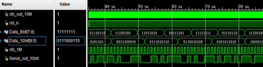 FPGA设计后,仿真结果如图4所示。其中Data_8bit是8bit原始数据,Data_10bit是经过8B/10B编码器编码后的10bit数据,Serial_out_10bit是并串转换模块输出的串行数据。从仿真结果可以看出,整个编码输出过程准确无误。