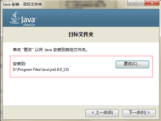 4、选择JRE的安装目录,“D:\Program Files\Java\jre1.8.0_131”,点击“下一步”;