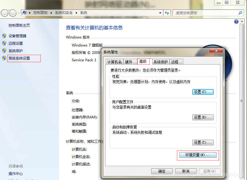 2、在弹出框,单击“高级系统设置”,选择“高级”,单击按钮“环境变量”;