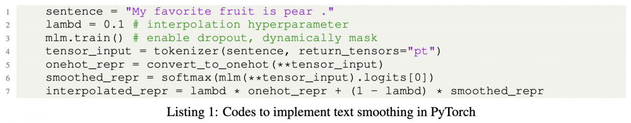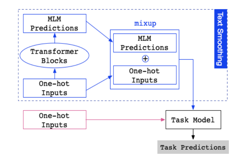上图是本文方法的架构图,首先看蓝色部分,从one-hot输入开始,经过一个MLM得到概率分布,然后和one-hot进行加权和代替原始的one-hot。接着看下面的红色部分,将加权和和one-hot结合,送到task model中,进行我们的分类任务。注: 这里的MLM模型是训练好的bert模型。