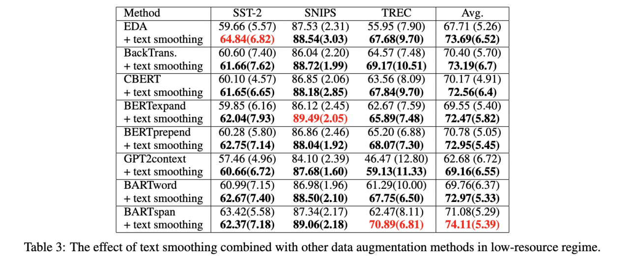 可以发现Text Smoothing方法提升还是比较明显的。因为Text Smoothing方法和其他增广方式可以联合使用,因为作者又做了以下实验: