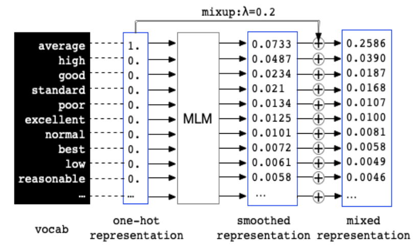 上图中最左边是词表,接下来是average的one-hot表示,通过MLM任务,得到average在词表中的概率分布,可以发现预测出average的概率最高,为0.0733,其余的high、good等概率都偏低,但可以发现,这些词和average在某种程度上有些相像。比如词性,或者是近义词等等。如果将这些词替换原句中的average,就可以对数据进行增强。但本文不是替换,本文采用mixup的方式,将概率分布和one-hot进行加权和,然后代替one-hot的作用,即: 之前one-hot是对embedding进行lookup,现在是对embedding进行了加权和。显然这样引入了其他词的信息,这样就实现了数据增强。